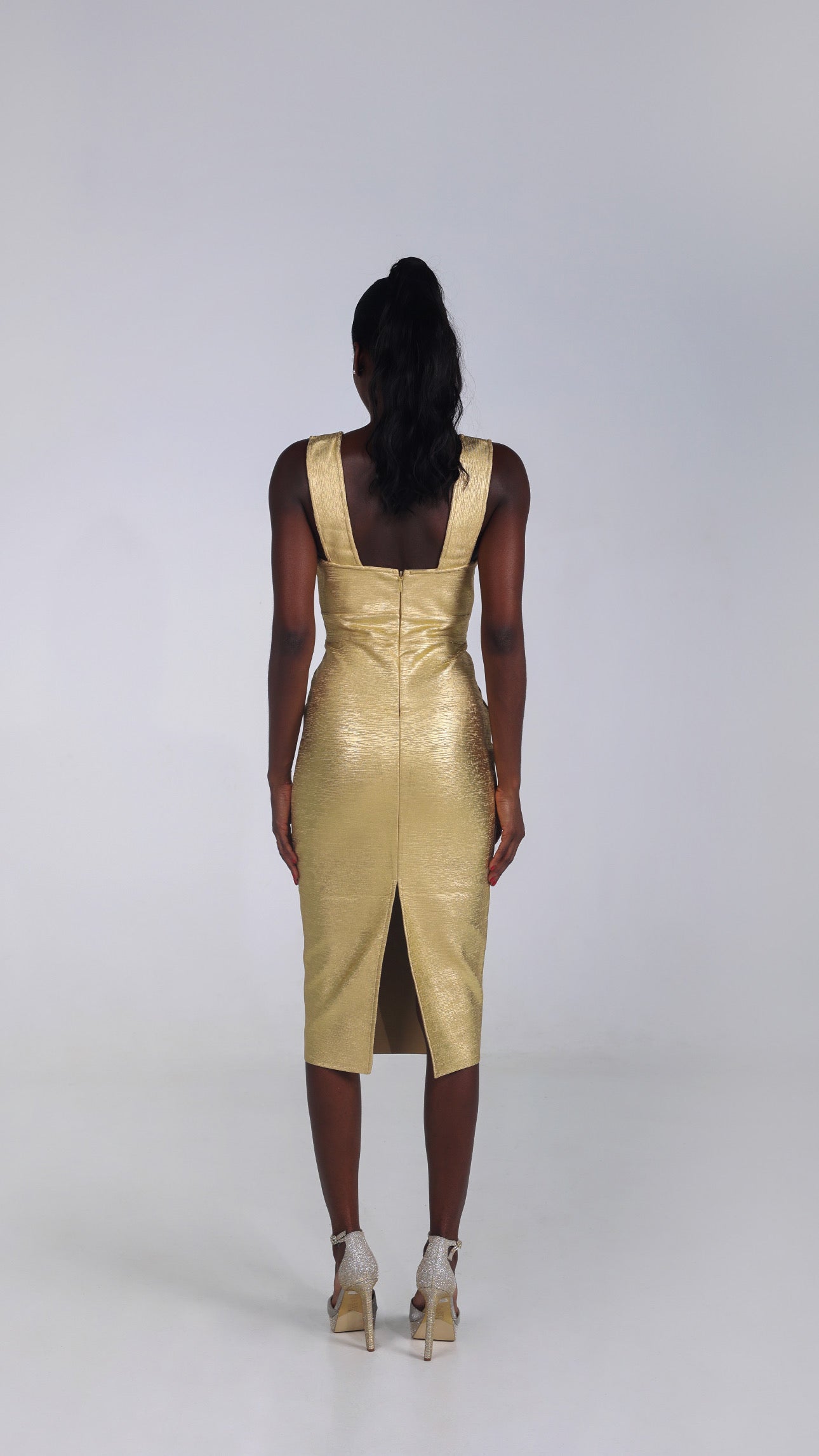 The Kasia Metallic Midi Bandage Dress is a show-stopping piece that exudes glamour and sophistication. This stunning dress features a metallic finish that catches the light beautifully, making you the center of attention at any event. The bandage design hugs your curves in all the right places, creating a flattering and sleek silhouette.